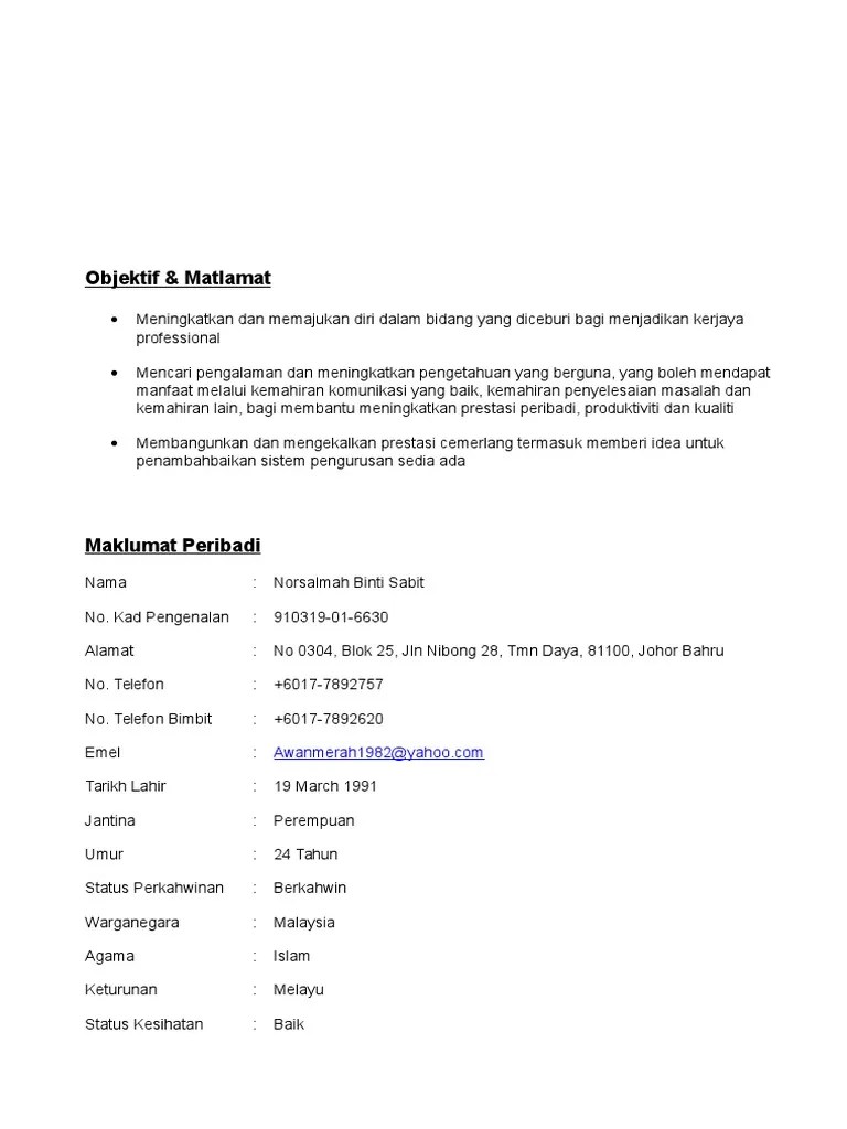 Anda boleh juga memasukkan profail ringkas yang merangkumi objektif kerjaya anda. Dapatkan template contoh resume lengkap bahasa melayu percuma di sini. Mahir bertutur dalam bahasa melayu dan bahasa inggeris; Latihan industri contoh resume untuk praktikal / 8 best resume bm ideas resume bahasa melayu kerjaya. Meningkatkan dan memajukan diri dalam bidang yang diceburi bagi menjadikan kerjaya professional. ٥ ذو القعدة ١٤٣٤ هـ. Contoh format resume lengkap terkini bahasa melayu dan bahasa inggeris. Kemahiran menggunakan applikasi komputer termasuk . Qaseh aneq contoh resume memohon kerja dalam bahasa melayu. Objektif & matlamat meningkatkan dan memajukan diri dalam bidang yang .